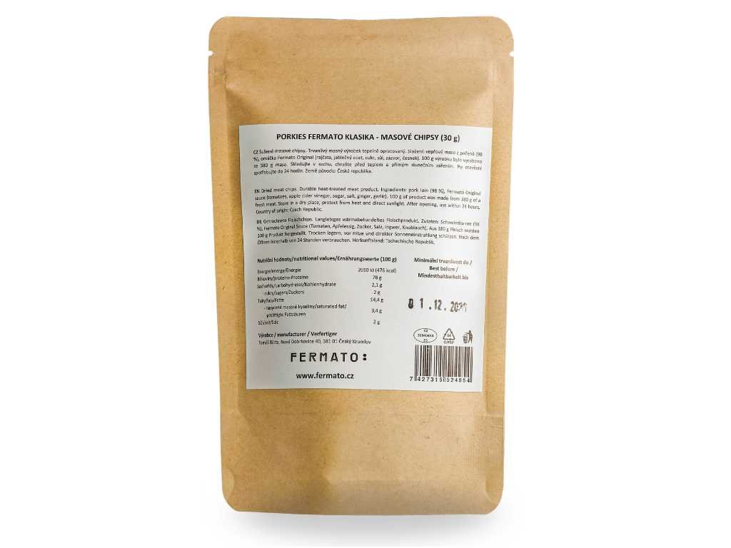 Rychlý snack plný bílkovin a chuti? Máme! Jen vepřová pečeně a Fermato Klasika – nic víc. Usušené do křupava. Do batohu, do auta, když nestíháte, nebo Vás honí mlsná. Proteiny vždy po ruce – a chuť, na kterou se budete těšit. Ideální jako rychlá svačina i jako mlsání k vínu nebo pivu.